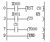 計(jì)數(shù)輸入X001每驅(qū)動C0線圈一次,計(jì)數(shù)器的當(dāng)前值就增加1,在執(zhí)行第5次的線圈指令時,輸出觸動作。以后即使計(jì)數(shù)輸入X001再動作,計(jì)數(shù)器的當(dāng)前值不變。如果復(fù)輸入X000為ON,則執(zhí)行RST指令,計(jì)數(shù)器的當(dāng)前值為0,輸出觸點(diǎn)復(fù)位。