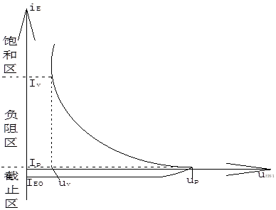 單結(jié)晶體管的特性曲線如圖2-2-14所示當(dāng)UBE1=0時,IE=IEO;當(dāng)UEB1增大至UP(峰點電壓時),PN結(jié)開始正向?qū),此時IE=IP(峰點電流);UEB1再增大一點管子就進入負阻區(qū),隨著IE增大,UEB1減小,直至UEB1=UV(谷點電壓),IE=IV(谷點電流),UV取決于PN結(jié)的導(dǎo)通電壓和rb1 的飽和電阻rs;當(dāng)IE再增大,管子進入飽和區(qū)。單結(jié)晶體管的三個區(qū)如圖2-2-14所標(biāo)注。