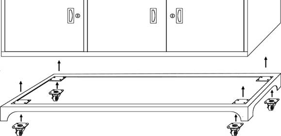 ② 將桌體翻轉(zhuǎn),圍板與萬向輪一同安裝到實驗臺桌身,注意孔位對齊。按照右圖所示