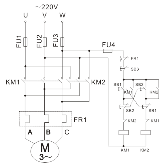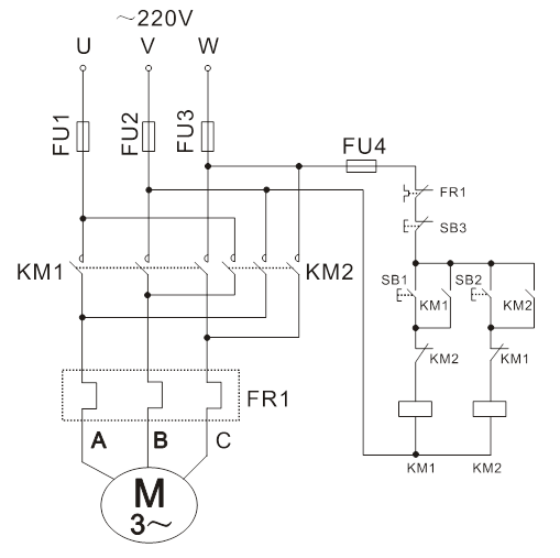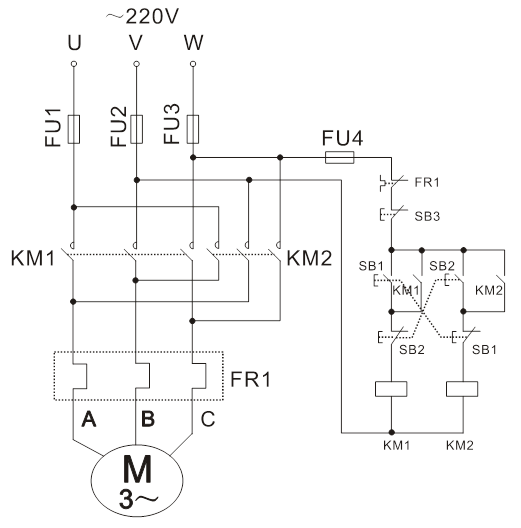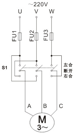 1、倒順開關(guān)正反轉(zhuǎn)控制線路: