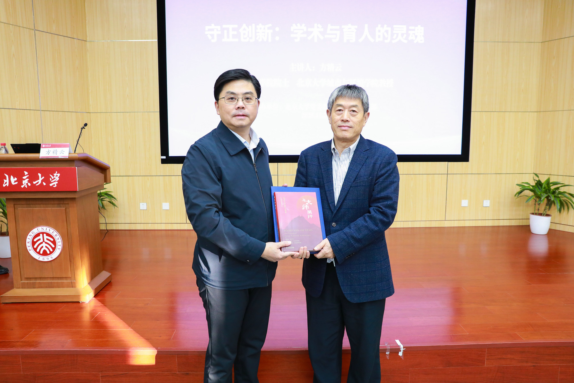 方方為方精云頒發(fā)“科學(xué)的緣分”——院士報(bào)告會(huì)暨博雅師德講堂紀(jì)念證書,并贈(zèng)送圖書《與大師同行——北京大學(xué)院士風(fēng)采》。