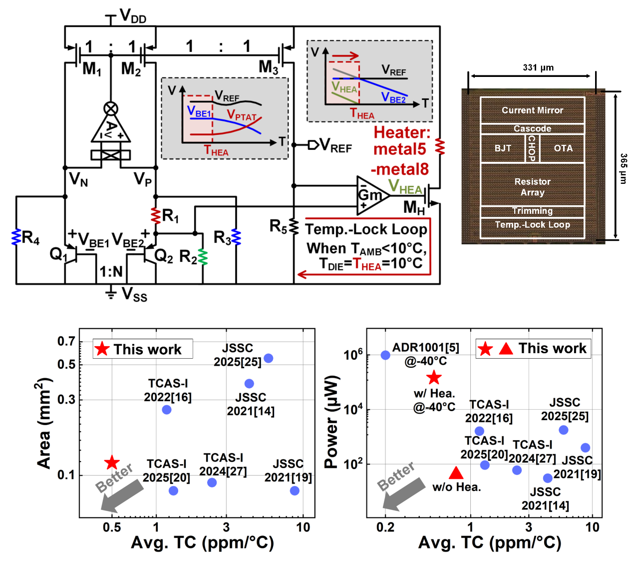 高精度電壓基準(zhǔn)電路結(jié)構(gòu)及顯微圖(上圖),面積、功耗與平均溫度系數(shù)性能對比(下圖)。
