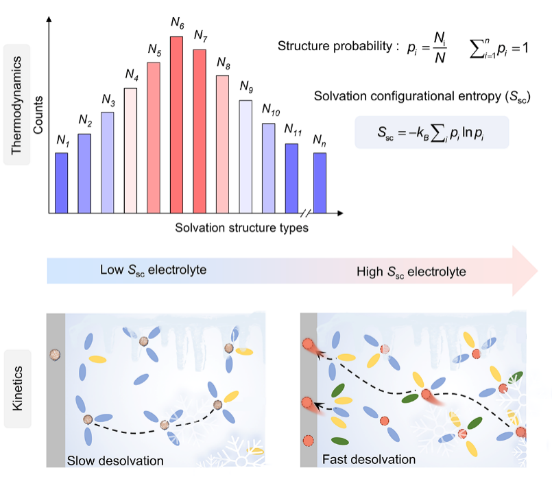 近日,湖南大學(xué)物理與微電子科學(xué)學(xué)院能量儲存團隊圍繞這一科學(xué)難題,提出“溶劑化結(jié)構(gòu)熵”(Solvation-Configurational Entropy,Ssc)的概念,并系統(tǒng)揭示了Ssc對低溫電池界面反應(yīng)動力學(xué)的調(diào)控機制,為發(fā)展高性能低溫電池提供了新的理論框架和設(shè)計思路。
