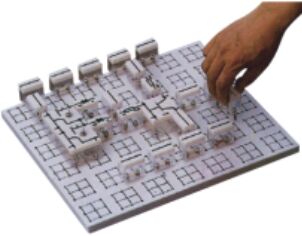 實驗桌一桌兩座,實驗桌中央配有通用九孔萬能插件板(尺寸:35×90cm ),九孔萬能插件板主體由ABS注塑而成,表面布有九孔成一組相互聯(lián)通的插孔,九孔萬能插件板內(nèi)部內(nèi)嵌126組銅質(zhì)九孔一體成型嵌件(共有1134孔)。實驗中的弱電模塊必須以獨立封裝的透明元件盒為單一模塊,元件盒統(tǒng)一都能配合九孔萬能插件板像搭積木一樣的形式自由搭建組合電路;元件盒盒體透明,內(nèi)裝元件直觀性好,盒蓋印刷電路圖防刮耐磨,符號美觀清晰。元件盒盒體與盒蓋采用較科學的壓卡式結(jié)構(gòu),維修拆裝方便。每張臺桌配有一粒膠皮板,保護通用底板與桌面(如需在桌上放置電動機、焊接等)。
