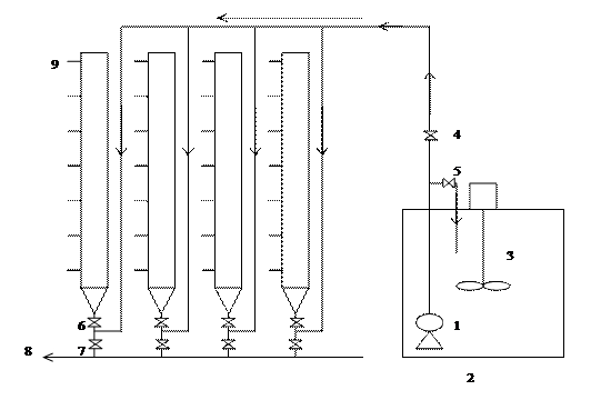 實驗裝置,每根沉淀柱在高度方向每隔150~250mm開設(shè)一取樣口,柱上部設(shè)溢流孔。將懸浮物濃度及水溫已知的水樣注入沉淀柱,攪拌均勻后開始計時,每隔20min、40 min、60 min、……分別在每個取樣口同時取樣50~100mL,測定其懸浮物濃度并利用下式計算各水樣的去除率。