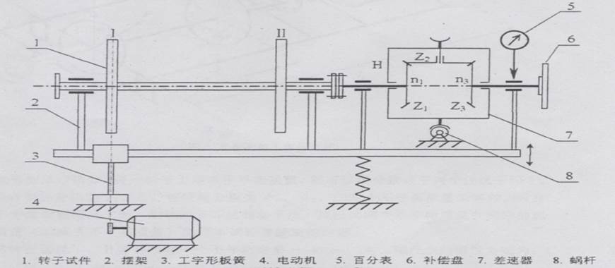 試件的不平衡質量的大小和相位可通過安裝在擺架的右端的測量系統(tǒng)獲得,這個測量系統(tǒng)由補償盤6和差速器7組成。差速器的左端為轉動輸入端(n1)通過柔性連軸器與試件連接;右端為輸出端(n3)與補償盤相連接。