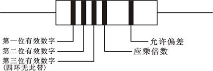 四環(huán)色標(biāo)是在五環(huán)基礎(chǔ)上去除第三環(huán);三環(huán)色標(biāo)是在五環(huán)基礎(chǔ)上去除第三環(huán)和第五環(huán),這時允許偏差約定為±20%。色標(biāo)的含義見表2-2-3