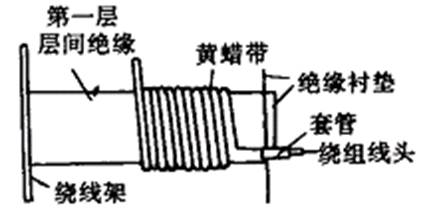 2)一層電纜紙與一層黃臘布重疊在一起繞兩周后用膠水粘牢,作為繞組對(duì)鐵芯間的絕緣。