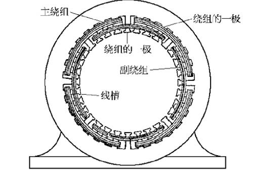 定子結(jié)構(gòu)有兩種形式。較大功率的采用和三相異步電動機相似的結(jié)構(gòu),定子鐵心也是用硅鋼片沖壓而成。鐵心槽內(nèi)放置有兩套繞組,一套是主繞組,也稱工作繞組,另一套是副繞組。俗稱起動繞組(內(nèi)總槽的1/3)。兩種繞組一般采用同心式繞組,其軸線在空間相隔90度電角度。功率較小的定子鐵心制成凸極形狀,磁極的一部分被短路環(huán)罩住,凸極上裝有主繞組,一般為集中式繞組。