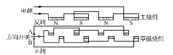 在隱極式罩極電動機中,可以正反方向運轉(zhuǎn),這種可逆電動機的定子槽中必須具有一套主繞組與兩套罩極繞組,其極數(shù)相同。當(dāng)電動機朝一個方向旋轉(zhuǎn)時,只有一套罩極繞組起作用。
