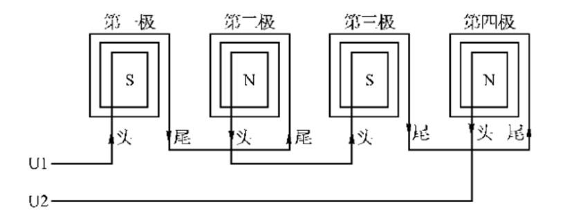 (2)不管電動機的極數(shù)有多少,同一繞組相鄰兩磁極的極性必須是相反的。所以兩相鄰線圈組的接法是,在串聯(lián)接線時應(yīng)當(dāng)是“反串聯(lián)”,即“頭—頭”連接或“尾—尾”連接。