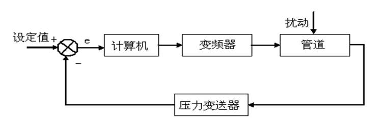 本實驗采用計算機控制,將壓力控制在設定值。將壓力信號輸出給計算機,計算機根據(jù)P、I、D參數(shù)進行PID運算,輸出信號給變頻器,然后由變頻器控制供水系統(tǒng)的進水壓力,從而達到控制設定壓力基本恒定的目的。壓力控制的方塊原理圖如下:
