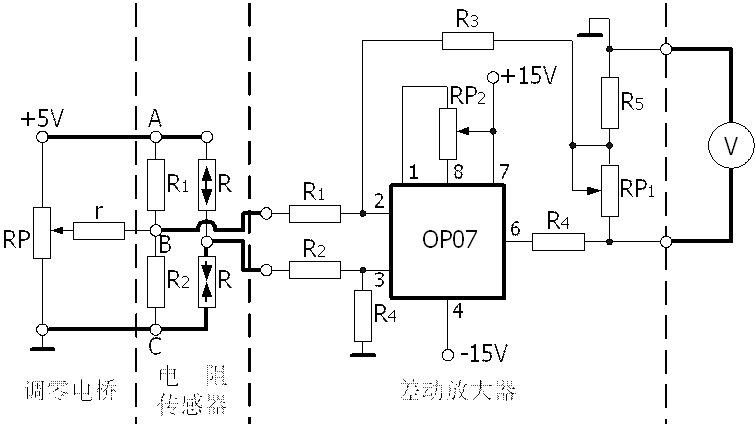 將兩個(gè)受力方向不同的應(yīng)變片電阻分別接入電橋的兩個(gè)相鄰橋臂,組成半橋形式的測量電路,轉(zhuǎn)換電路的輸出靈敏度提高,非線性得到改善。
