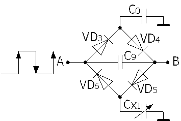 固定頻率的方波脈沖由A點(diǎn)輸入,在方波的上升沿,C0被充電,充電途徑是VD3→C0;與此同時,Cx1也被充電,其充電途徑是C9→VD5→Cx1。在方波的下降沿,C0和Cx1都放電,C0的放電途徑是C0→VD4→C9;Cx1的放電途徑是Cx1→VD6。由于C9在一個周期內(nèi)的充電和放電平均電流分別為:IU=fVPCx1和ID=fVPC0,式中f是脈沖頻率,VP為方波峰值電壓,因此AB間的平均電流I=ID-IU=fVP(C0-Cx1)。從該式中可以看出電容的變化與AB間的電路成正比。