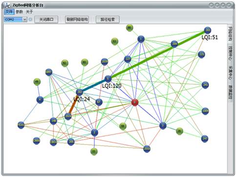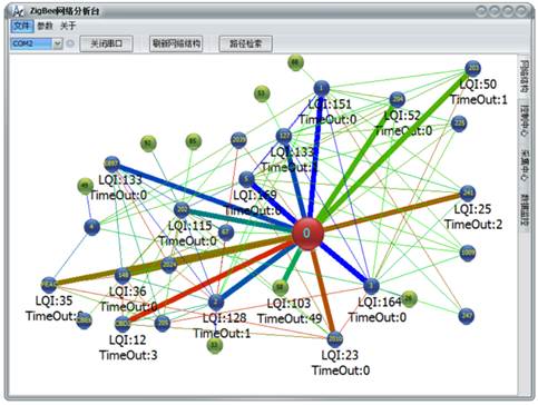 ZigBee 串口透傳模塊及配套方案是基于 IEEE 802.15.4/ZigBee 協(xié)議棧的 2.4G ZigBee 無線串口透明傳輸通信模塊。模塊采用十年來行業(yè)主流的 TI 高性能低功耗的 2.4G 射頻收發(fā)芯片 CC2530 及大功率低噪聲射頻前端芯片 CC2591,實現(xiàn)極易使用、全透明、高穩(wěn)定、超低功耗、超遠(yuǎn)距離、超大規(guī)模 ZigBee 無線傳感網(wǎng)絡(luò)的組網(wǎng)。典型的 ZigBee 網(wǎng)絡(luò)如圖 1.1 與圖 1.2 所示。圖截取自我司可視化 ZigBee 實時控制調(diào)試工具。 ZigBee 網(wǎng)絡(luò)是一種小數(shù)據(jù)量的無線射頻網(wǎng)絡(luò),由非休眠的主機(CO)、路由(RO)與休眠的終端(EN) 節(jié)點構(gòu)成,圖中分別由紅、藍(lán)、綠色點表示。網(wǎng)絡(luò)有如下特點: