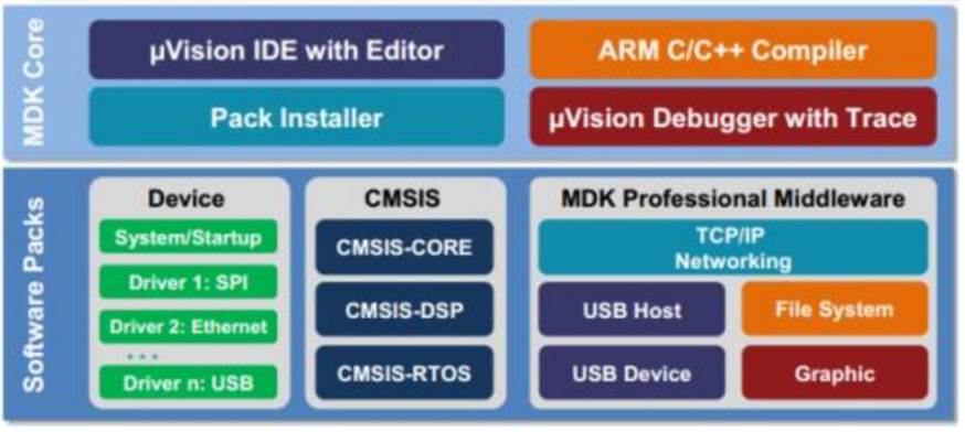 MDK 源自德國的 KEIL 公司,是 RealView MDK 的簡稱。在全球 MDK 被超過 10 萬的嵌入式開發(fā)工程師使用。目前最新版本為:MDK5.14,該版本使用 uVision5 IDE 集成開發(fā)環(huán)境,是目前針對 ARM 處理器,尤其是 Cortex M 內(nèi)核處理器的最佳開發(fā)工具。MDK5 向后兼容 MDK4 和 MDK3 等,以前的項目同樣可以在 MDK5 上進行開發(fā)(但是頭文件方面得全部自己添加), MDK5 同時加強了針對 Cortex-M 微控制器開發(fā)的支持,并且對傳統(tǒng)的開發(fā)模式和界面進行升級,MDK5 由兩個部分組成:MDK Core 和 Software Packs。其中,Software Packs 可以獨立于工具鏈進行新芯片支持和中間庫的升級。如下圖所示。