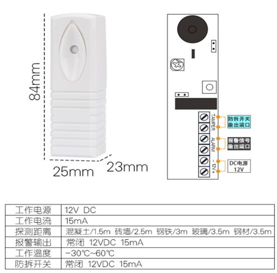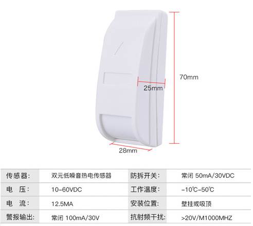 震動傳感器按在需要防范的地方,當有不法分子試圖強行打開,撬開時振動傳感器監(jiān)測到有異常振動聲音時就會立即發(fā)送報警信號給報警主機驅(qū)動喇叭現(xiàn)場警示并通知相關(guān)人員有警情發(fā)生,本教材所用振動傳感器體積小巧,安裝方便不占空間更加隱蔽,適合各類需要防范設(shè)備的安裝。4.4.1 傳感器參數(shù)