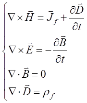 在理想介質(zhì)中,既沒(méi)有電荷,也沒(méi)有電流,所以理想介質(zhì)中的電磁場(chǎng)滿(mǎn)足無(wú)源的麥克斯韋方程組。無(wú)源無(wú)耗媒質(zhì)中電磁場(chǎng)滿(mǎn)足麥克斯韋方程: