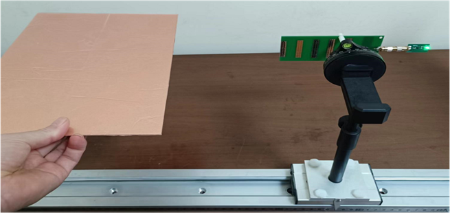 4)將水平水平縫隙柵格平面放入收發(fā)天線中間,觀察LED燈是否被點亮。