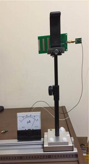 圖3用微安表測(cè)量H面方向圖測(cè)量 圖4用LED燈的強(qiáng)弱顯示天線E面方向圖