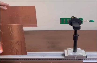 當(dāng)用直射線和兩條反射線疊加相位相等時(shí)LED最亮,相位相反時(shí),接收電磁波抵消LED不亮。移動(dòng)距離中軸線的距離d,接收LED時(shí)滅時(shí)亮,某一個(gè)位置時(shí)達(dá)到最亮。記錄下距離中軸線的距離d,計(jì)算直射線和反射線的距離差值。反射線經(jīng)過導(dǎo)體板反射時(shí)有180度的相位差。