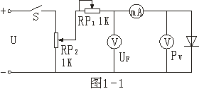 將RP2和作限流作用的RP1阻值調(diào)至最大位置,穩(wěn)壓電源輸出電壓調(diào)至5V,合上開(kāi)關(guān),分別調(diào)節(jié)RP1和RP2,觀察不同正向電壓UF時(shí)流過(guò)二極管的電源和該管兩端的電壓PV。