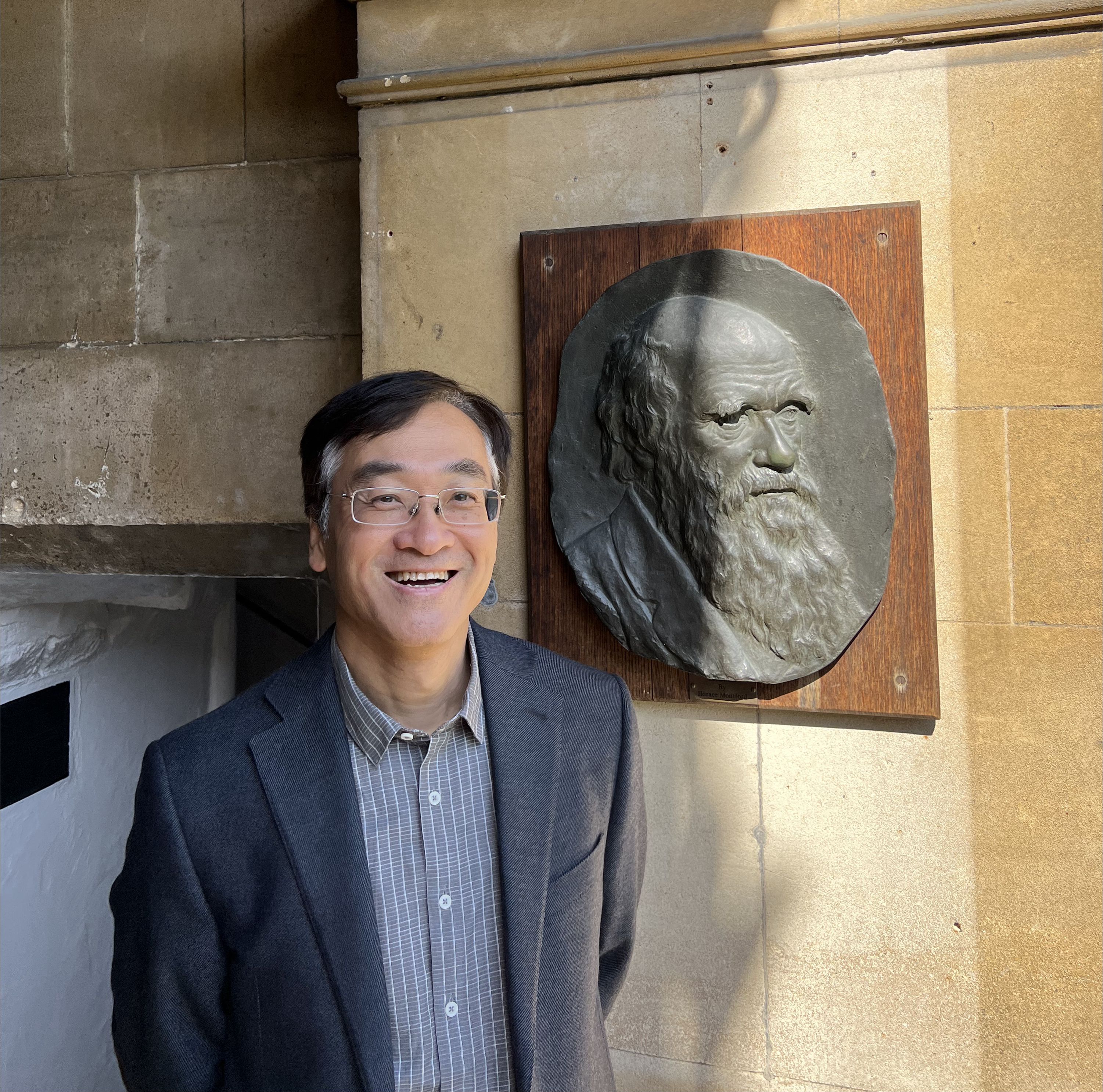 瞿禮嘉在劍橋大學(xué)訪學(xué)時,與達(dá)爾文像合影